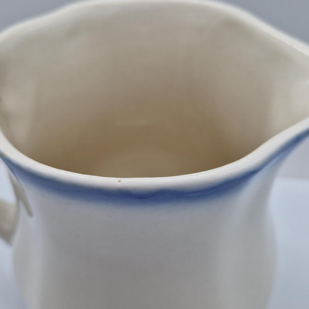 Arabia Maitokannu Nina, piippuleimalla. Arabian valmistama IO-sarjan maitokannu, sininen kukka puhalluskoriste tuntee nimen Nina. Näitä kaatimia vietiin 1950-luvun alussa Yhdysvaltoihin.