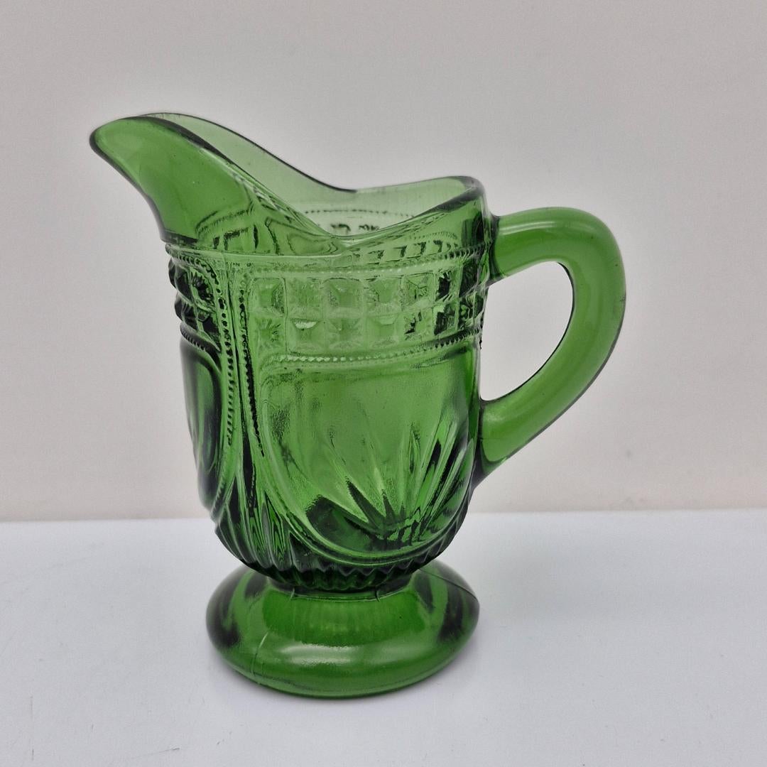 Riihimäen Lasin kermakko, suunnitteluvuosi 1926. Upea vihreä väri. Vastaavaa mallia tehty myös kirkkaana, tällöin vuosikerta jopa tätäkin vanhempi, tuotanto kirkkaalle aloitettu 1915.