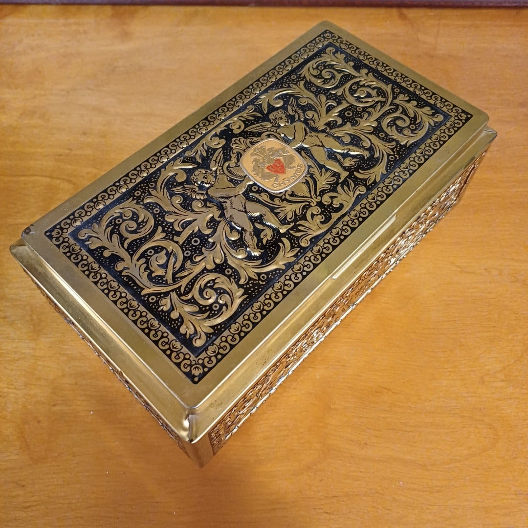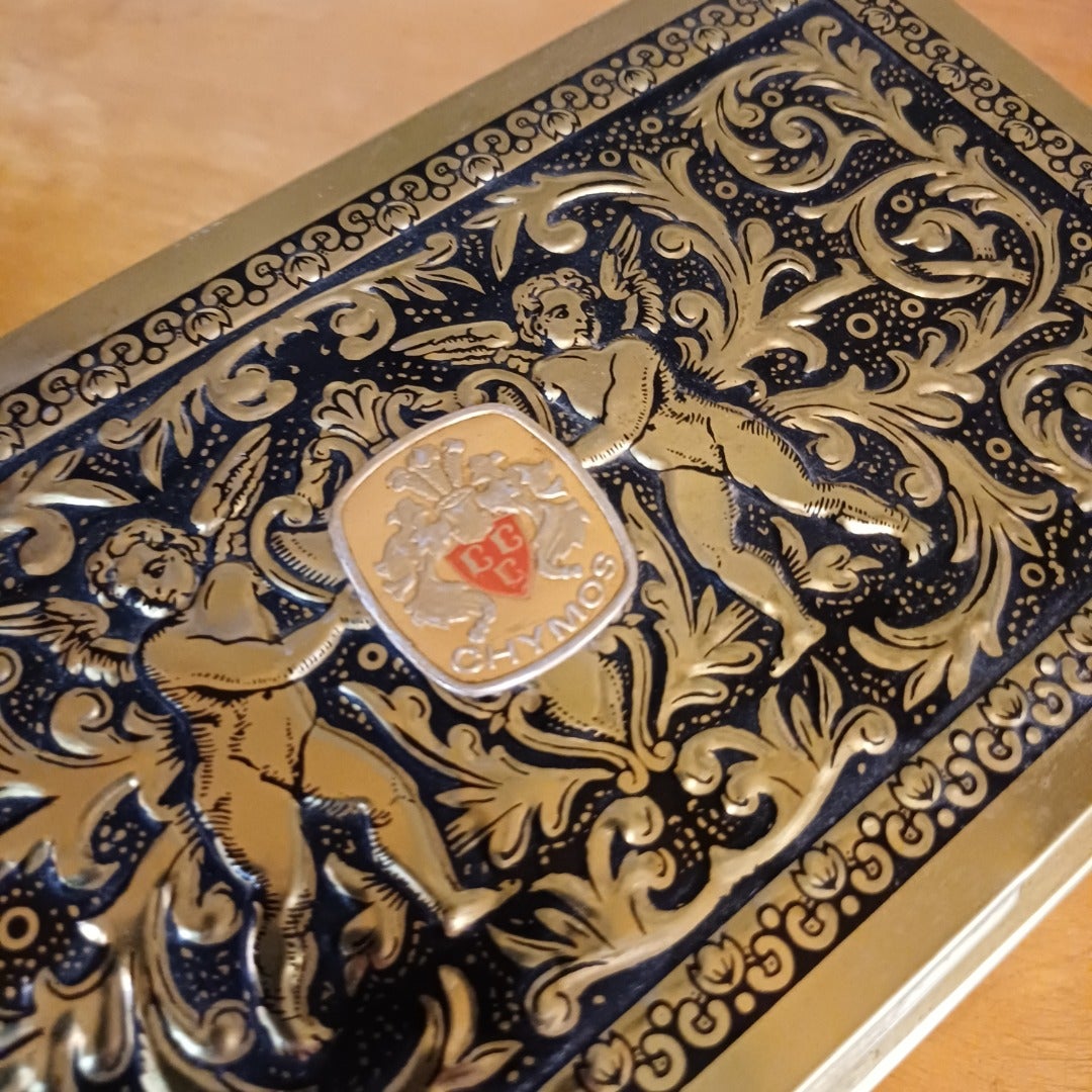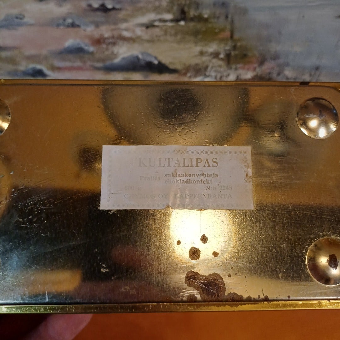 Chymos Kultalipas Peltirasia. Chymoksen hieno Kultalipas suklaakonvehteja-peltirasia on sisältänyt 500 g kyseisiä herkkuja. Rasian korkeus 8 cm, pituus 20,5 cm ja leveys 11,5 cm.